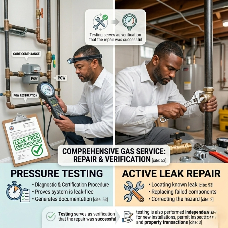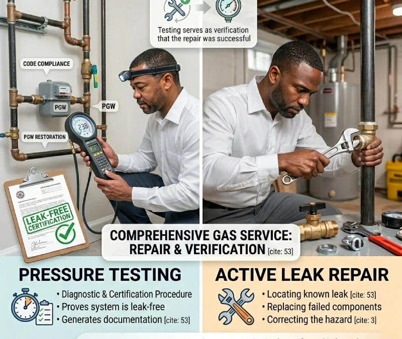 If a gas line failed a prior pressure test — whether performed by another company, a PGW inspector, or a city inspector — the leak must be located, repaired, and the test re-run by a licensed professional before any forward progress can happen.